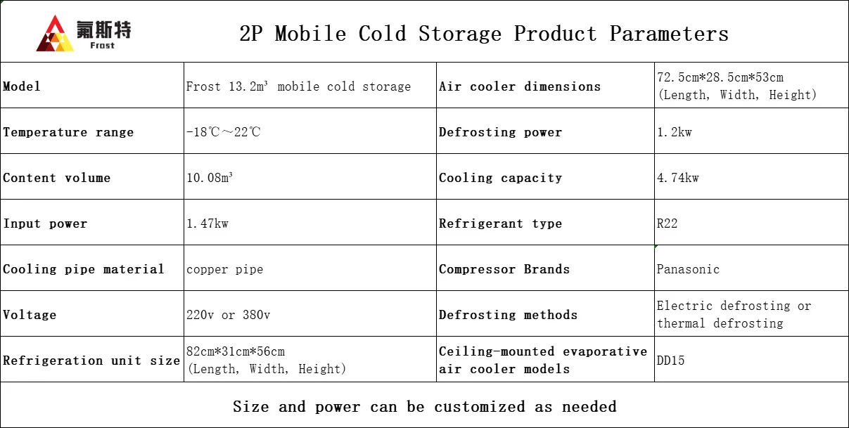 يستخدم مخزن التبريد المتنقل Frost وحدات تبريد عالية الكفاءة ومناسبة لتخزين ونقل المواد الغذائية والأدوية والسلع الأخرى. تم تجهيز غرفة التبريد بنظام التحكم المزدوج في درجة الحرارة، والذي يمكنه تحقيق منطقتين مستقلتين للتحكم في درجة الحرارة في نفس المساحة لتلبية متطلبات درجات الحرارة المختلفة.